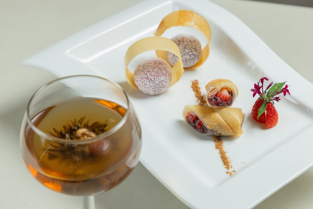 ディナーのデザートタイムに、光の道をイメージした開運スイーツをご用意。運を開くジャスミン茶で食後のディータイムをお楽しみください。