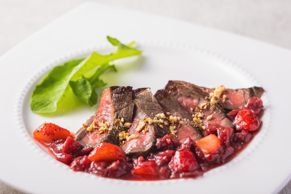 “無頭牛”是當地酒窖的酒糟、豆腐店的豆腐渣等拘泥於國產飼料的名牌牛。現場廚房裡烤製的紅肉,其特徵是能完全吃到肉的美味。除了岩鹽之外,還可以品嘗到廚師長講究的5種醬汁。